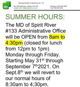 The MD of Spirit River #133 office will be CLOSING at 4 pm on Friday, May 21st.