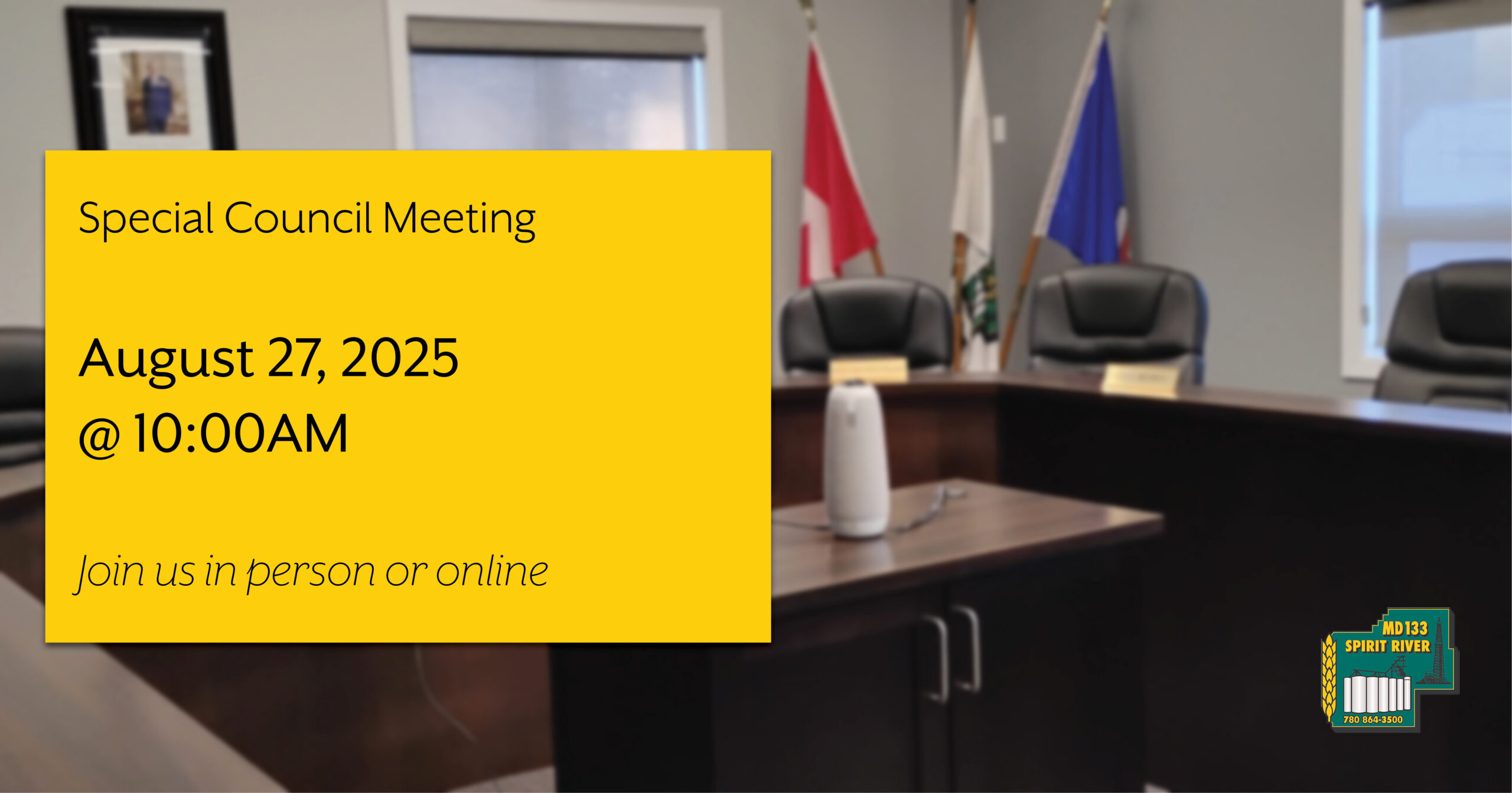 Notice is hereby given that Reeve Tony Van Rootselaar is calling a Special Meeting of Council of the Municipal District of Spirit River No. 133 to be held on Wednesday, August 27thth, 2025 at 10:00 a.m. in Council Chambers, Municipal District of Spirit River Administration Building, located at 4202 – 50th Street, Spirit River, Alberta.