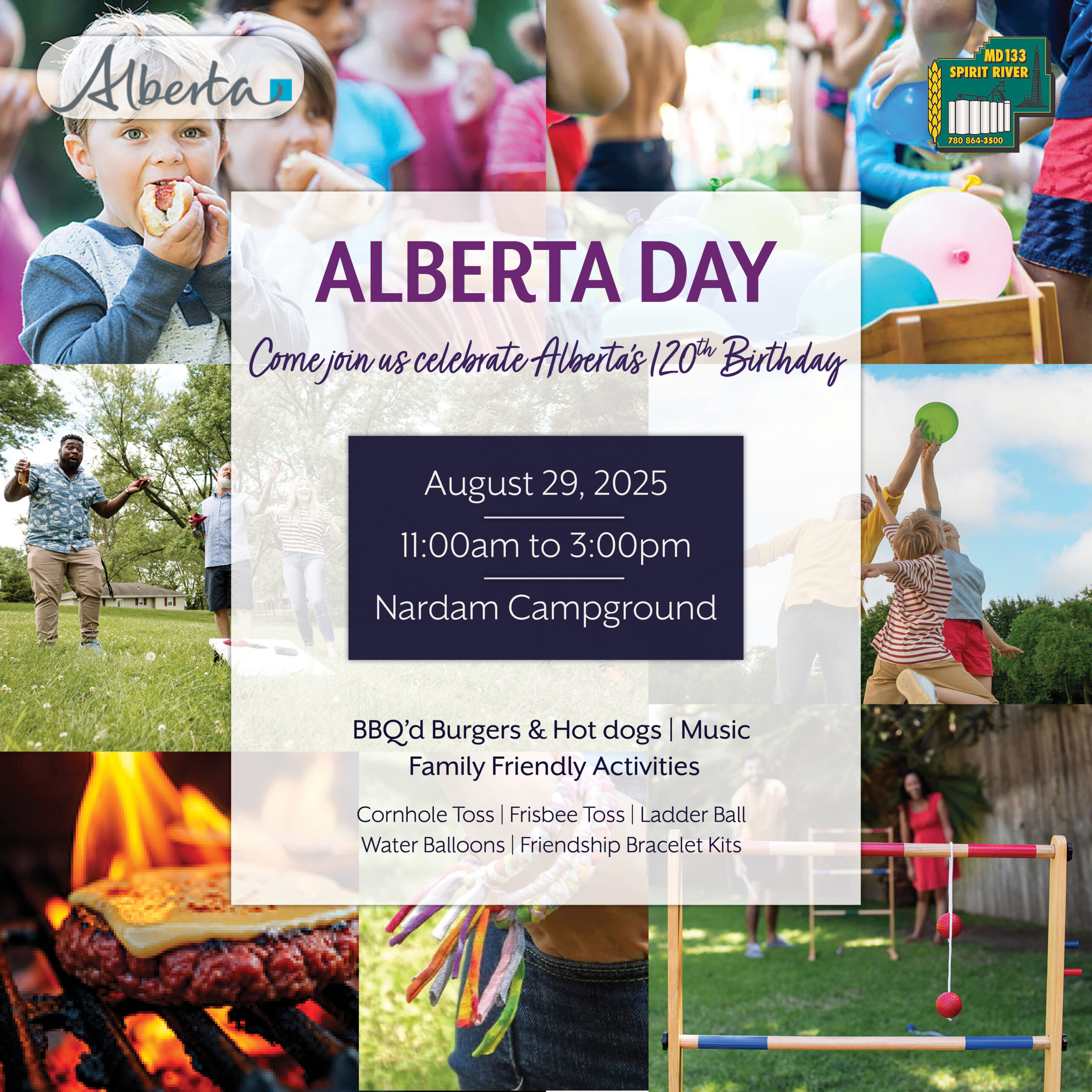 Join us for a 120th Birthday Party for our beautiful province, on 𝗔𝘂𝗴𝘂𝘀𝘁 𝟮𝟵𝘁𝗵 from 𝟭𝟭:𝟬𝟬𝗔𝗠 𝘁𝗼 𝟯:𝟬𝟬𝗣𝗠, at the 𝗡𝗮𝗿𝗱𝗮𝗺 𝗖𝗮𝗺𝗽𝗴𝗿𝗼𝘂𝗻𝗱 where the MD of Spirit River will be hosting a BBQ, music, and family-friendly activities for everyone.