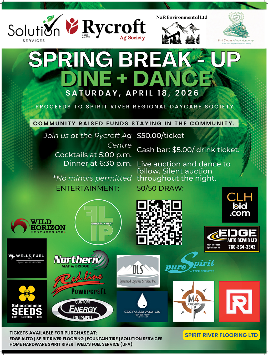 Community members are invited to attend the Spring Break-Up Dine & Dance Fundraiser on Saturday, April 18, 2026, at the Rycroft Ag Centre. The annual event is organized by Solution Services and NaR Environmental Ltd., in partnership with the Rycroft Ag Society, and raises funds to support important local projects.