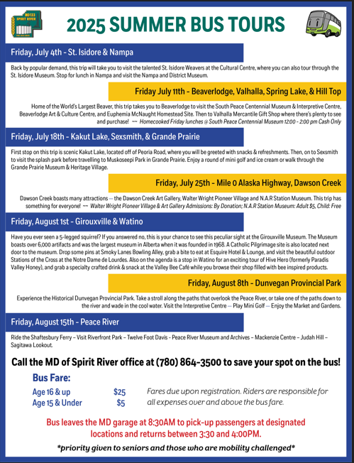 A transit bus sponsored by the Municipal District of Spirit River No. 133 transports passengers from Spirit River and Rycroft to Grande Prairie every Tuesday, Wednesday and Thursday. Passengers 16 and younger must have signed permission by Guardians to ride. The bus goes with a minimum of 1 passenger. Book your seat months in advance, or just 24 hours in advance. Medical appointments are priority booking. Contact the MD office at 780-864-3500 to book.